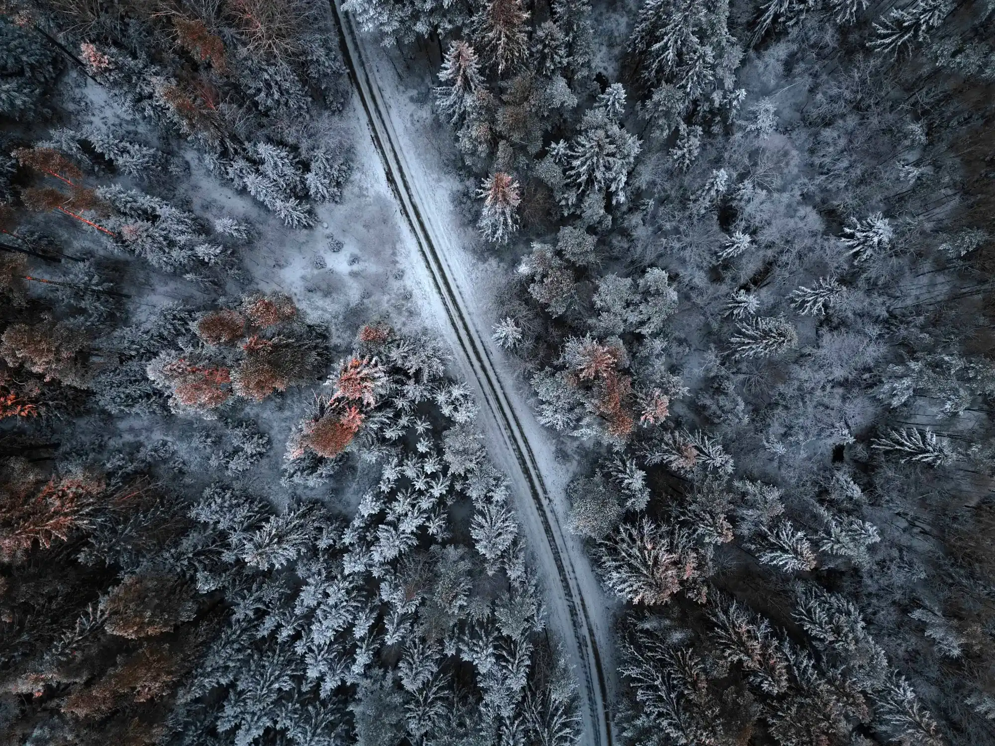 Drone photograph of a cold winter’s evening while the sun was setting and colored the treetops red.
