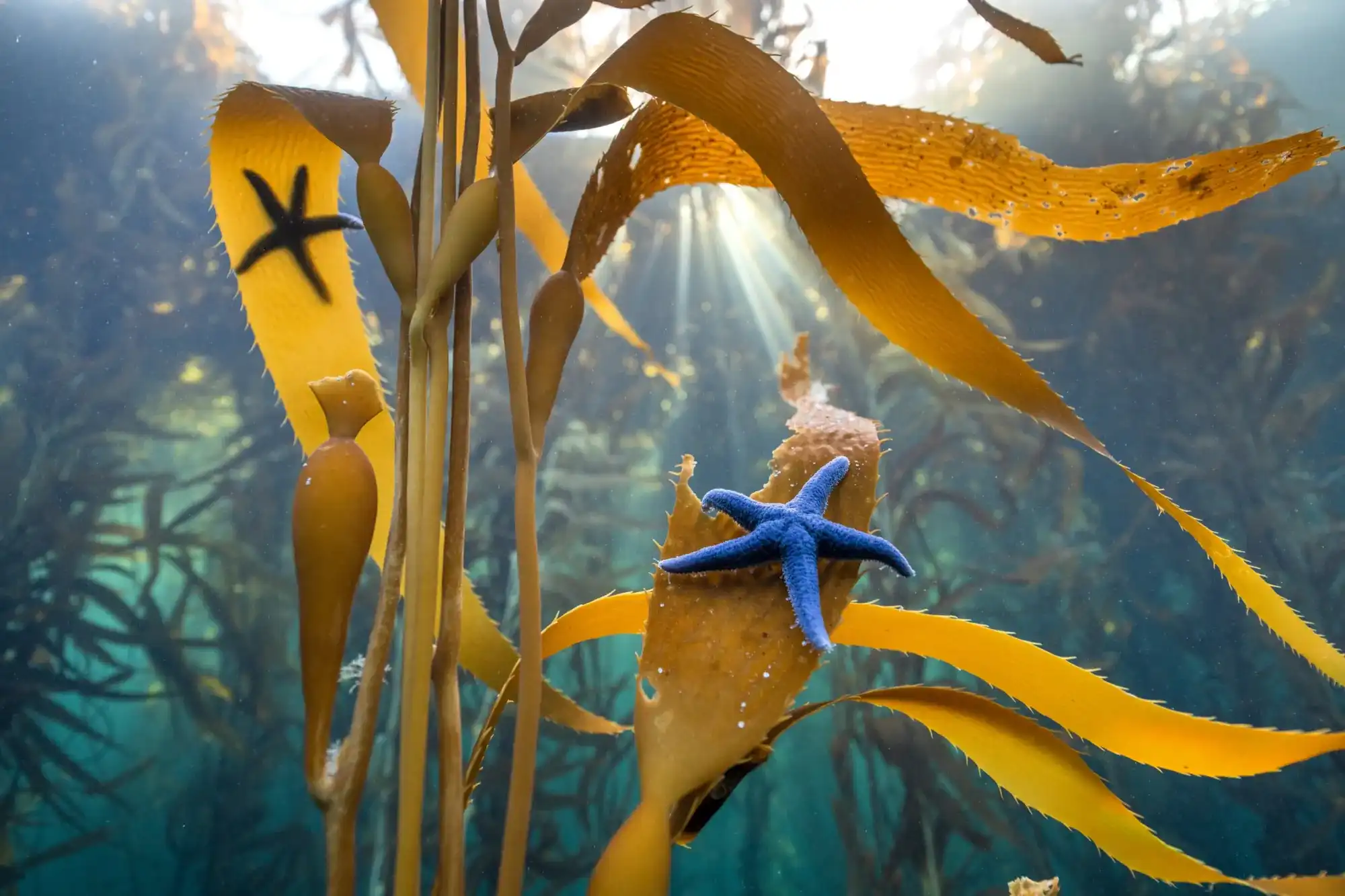 This image was taken during a dive off the southernmost shores of the Mitre Peninsula, one of the most unexplored areas of Tierra del Fuego’s Isla Grande. At the end of the dive, during the safety stop at a depth of about three meters, I came across this delicate scene: a pair of blue starfish resting on the undulating sheets of Macrocystis pyrifera, the large seaweed that dominates the underwater forests of this remote region.