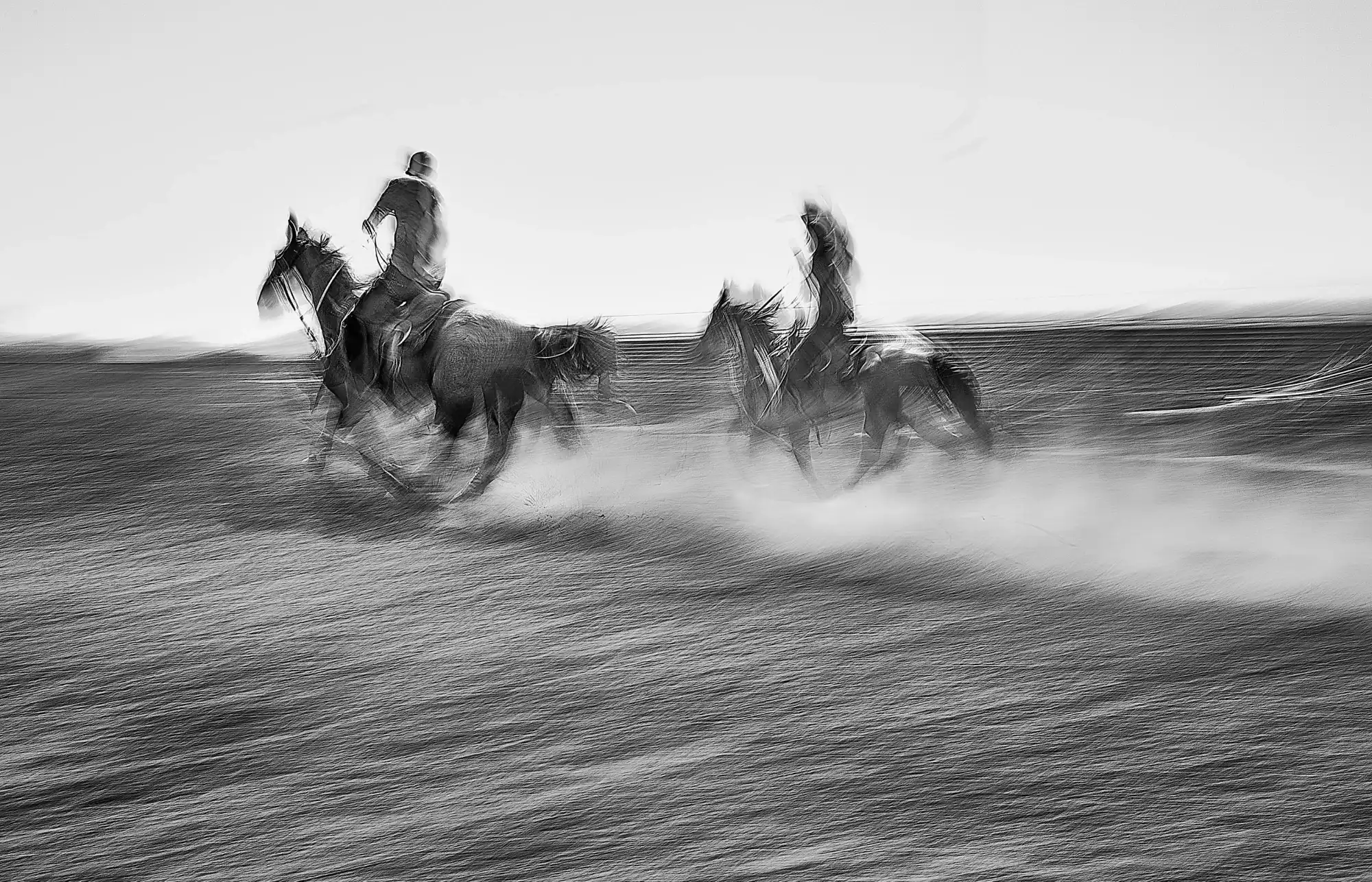 This is a photograph of two cowboy team ropers pursing a steer at a jackpot rodeo in Oakdale, California. The image was shot in June, 2025. The technique is called panning, where the camera shutter speed is dramatically reduced while the f/stop is greatly increased. By implementing this technique, the capture provides a greater sense of motion than if it was a stop-action shot. Moreover, the photo in black and white gives the image an even more classic Western look than if it was presented in color.